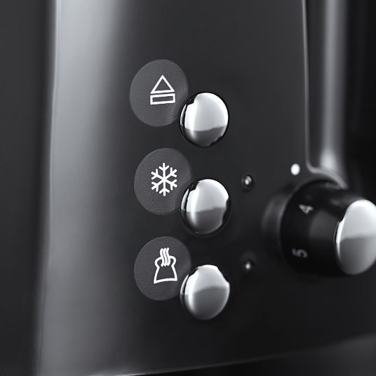 Textures Plus toster, sa divnom kombinacijom mat i crne boje visokog sjaja, ima niz funkcija koje će vam biti nezamenljive. Ima ekstra široke i dugačke otvore, tako da možete tostirati baget i debele kriške hleba.