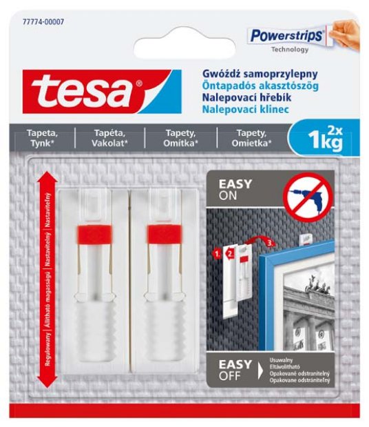 Tesa® Nosač za vešanje predmeta na tapete i malter zajedno sa odgovarajućim Powerstrips® trakama (uključenim) obezbeđuju sigurno držanje na teksturiranim i osetljivim površinama do 1 kg po nosaču. Podešavanje visine čini ih posebno pogodnim za vertikalno poravnavanje slika ili korišćenje dva nosača za jednu sliku. Tehnologija Powerstrips® čini ih uklonjivim bez traga.