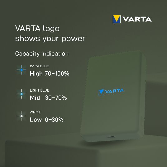 - Osvetljeni VARTA logo pokazuje koliko kapaciteta je preostalo u power banku: