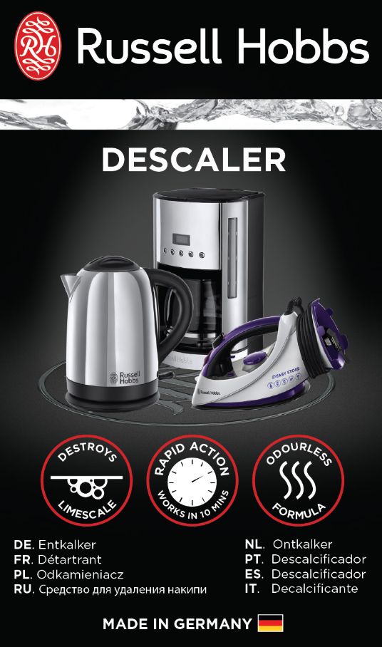 Russell Hobbs savršeno poznaje kućne aparate. Kao jedan od vodećih svetskih brendova za svakodnevne potrepštine, poput kuvala, aparata za kafu i pegli na paru, znamo kako da izvučemo maksimum iz uređaja na koje se oslanjate svakog dana. Zato smo razvili višenamensko sredstvo za uklanjanje kamenca koje eliminiše naslage za manje od 10 minuta. Bez mirisa je, bezbedno za upotrebu u kuvalima i aparatima za kafu, a samo jedno nanošenje uklanja kamenac koji bi mogao skratiti vek trajanja vašeg uređaja.
