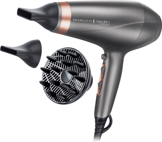 Snažan fen za kosu Keratin Protect od 2200 W je moderne tamno sive i ružičasto zlatne boje i ima rešetku sa slojem keramike, koja omogućava brzo zagrevanje i ravnomerno širenje toplote te generator jona koji proizvodi 90%* više jona za sprečavanje pojave naelektrisanih dlaka, zadržavajući vlagu za sjajnu i glatku kosu.